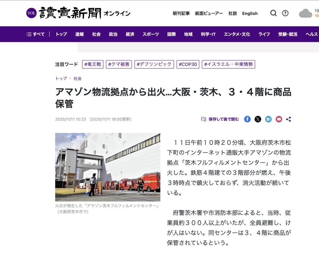 アマゾンFBA 大阪茨木倉庫が火事で大騒ぎです。